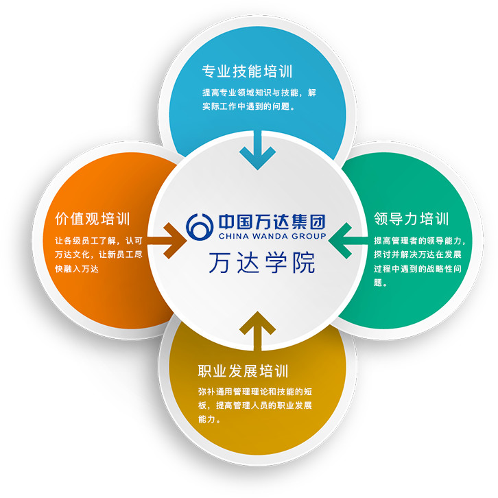 2013年7月,萬(wàn)達(dá)學(xué)院正式成立,標(biāo)志著萬(wàn)達(dá)集團(tuán)員工培訓(xùn)發(fā)展工作進(jìn)入新的里程碑。萬(wàn)達(dá)學(xué)院由5個(gè)職能部室與5個(gè)培訓(xùn)單元構(gòu)成。職能部室包括行政管理處、測(cè)評(píng)管理處、外聯(lián)管理處、職前培訓(xùn)管理處和提升培訓(xùn)管理處,配套設(shè)立了圖書閱覽室和檔案室。培訓(xùn)單元包括素質(zhì)拓展中心、益智中心、教學(xué)中心、電子信息中心、競(jìng)技中心等。